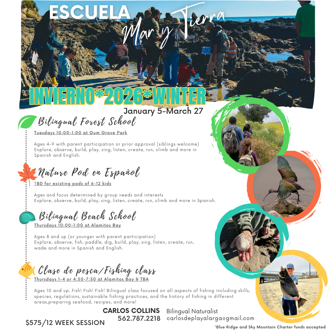 Our amazing coastal ecosystems will surround us as we explore, observe, paddle, dig, build, play, sing, listen, create, run and climb. We will learn from nature and one another in Spanish and English. This is a 3 hour weekly parent participation class for ages 4-9. You may mix and match with the Bilingual Beach School. Pricing as follows: $750 for 16 classes, $575 for 12 classes, $390 for 8 classes and $50 for 1 class.