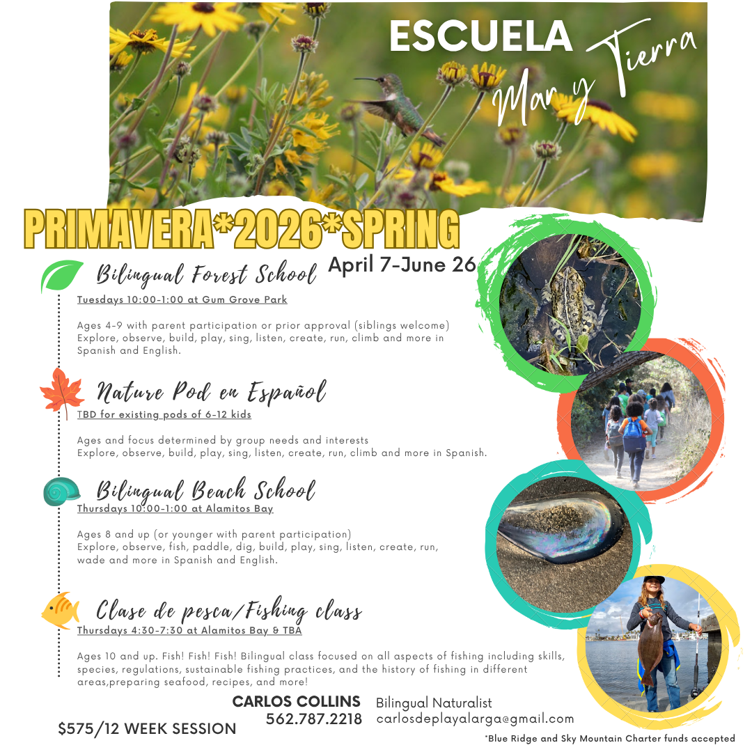Join me for a slow, easy 3 hour hike and bilingual birding class at a local birding hot spot! We are so lucky to have such a wonderful variety of birds in our area. Come learn where to look for and how to identify some of our avian friends. Learn about their special adaptations for survival and help scientists collect important data. (Parents with students are always free of charge. 2nd sibling is $20, 3rd+ siblings are $10.)